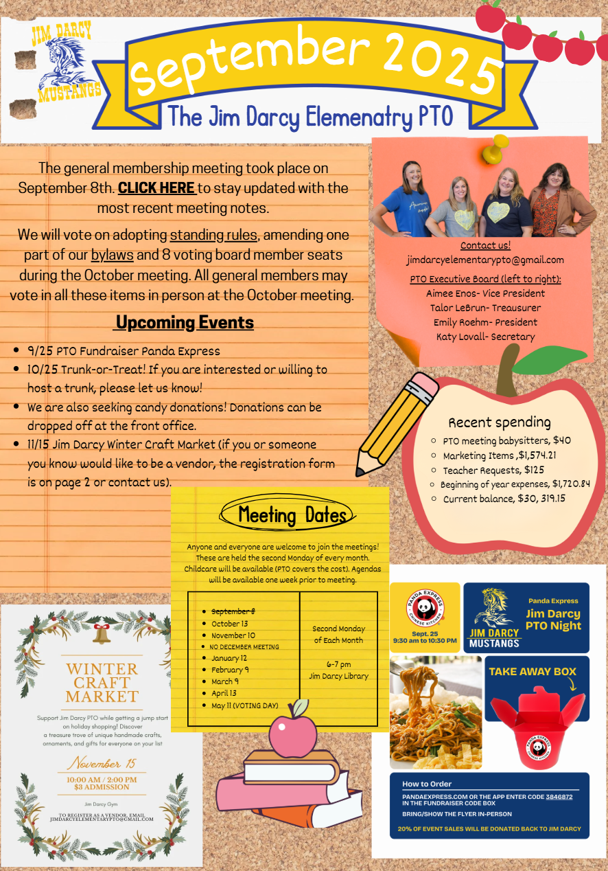 Jim Darcy PTO consists of parents and staff working together to support and enrich our students with a focus on improving and creating community at our school. We plan and discuss different events, fundraisers, school needs, etc. We encourage all parents to participate in PTO activities whenever possible.